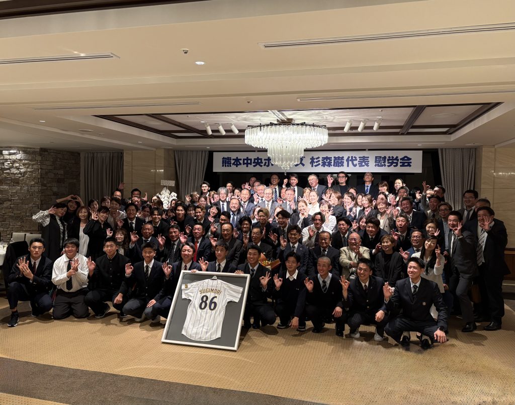 2025.10.25(土) 杉森巌前代表の慰労会がOB会主催にて熊本ホテルキャッスルで開催されました。当日は来賓として、元ボーイズリーグ副会長兼九州ブロック長:中尾孝義様、ボーイズリーグ熊本支部相談役:東敏明様、ボーイズリーグ熊本支部事務局:中尾秀子様をお迎えし、球団役員はじめOBの皆様方、OB保護者の皆様方他大勢の方々が参加され盛大に開催されました。杉森巌前代表より、前身のクラブチームから熊本中央ボーイズの発足までの歩みや、熊本中央ボーイズのこれまでの軌跡や過去のエピソード等、貴重なお話を頂戴致しました。また、卒団生でプロ野球選手である桑原秀侍選手・津田啓史選手・吉村優聖歩選手からのビデオレターやOB会からの記念品贈呈等、感動的で印象に残る会でした。改めて杉森巌前代表の功績と長年のご苦労に対し深甚なる感謝の意を表します。熊本中央ボーイズを設立頂き、長い間ご指導賜り心より御礼申し上げます。なお、杉森巌前代表にはこれからも顧問として球団に残って頂きます。引き続きご指導賜りますようお願い申し上げます。